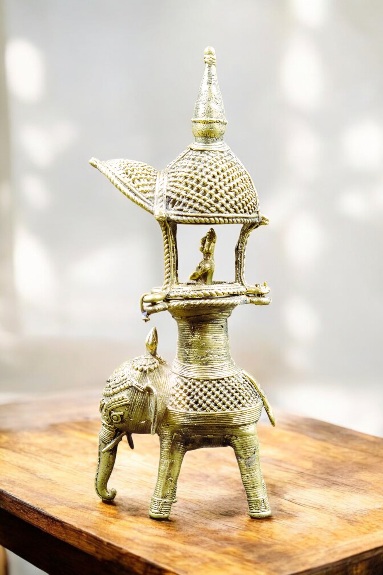 Discover the exquisite Dhokra Elephant Sabari Metal craft, an exceptional piece of art that merges ancient indian craftmanship with contemporary décor. This stunning work features an intricately designed elephant, symbolizing strength and auspiciousness,