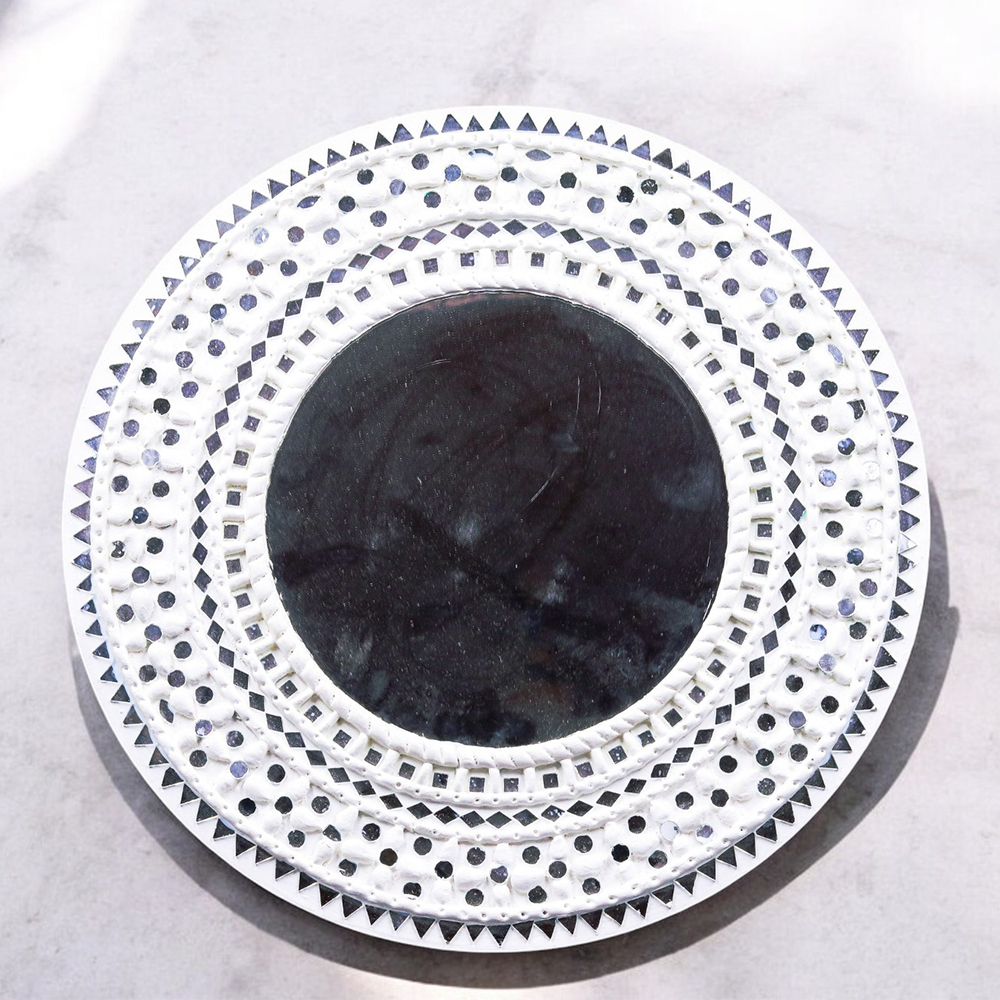 Artfully captures a circular mirror midst of the frame enclosed by circular mandala patterns designed with small mirrors possessing different shapes. Such a design is a beautiful and intricate piece of art. The use of mirrors and mandala patterns adds complexity and visual interest to the artwork, making it aesthetically pleasing. Mirrors have long been associated with self-reflection, placing a central mirror within a mandala symbolizes the idea of introspection and self-awareness. The circular shape represents the cyclical nature of life and the interconnectedness of all things. Mirrors reflect and amplify light, this design is seen as a way to enhance the energy and light in a space, making it more vibrant and positive. Mandalas are often used in various spiritual traditions as tools for meditation and spiritual growth.